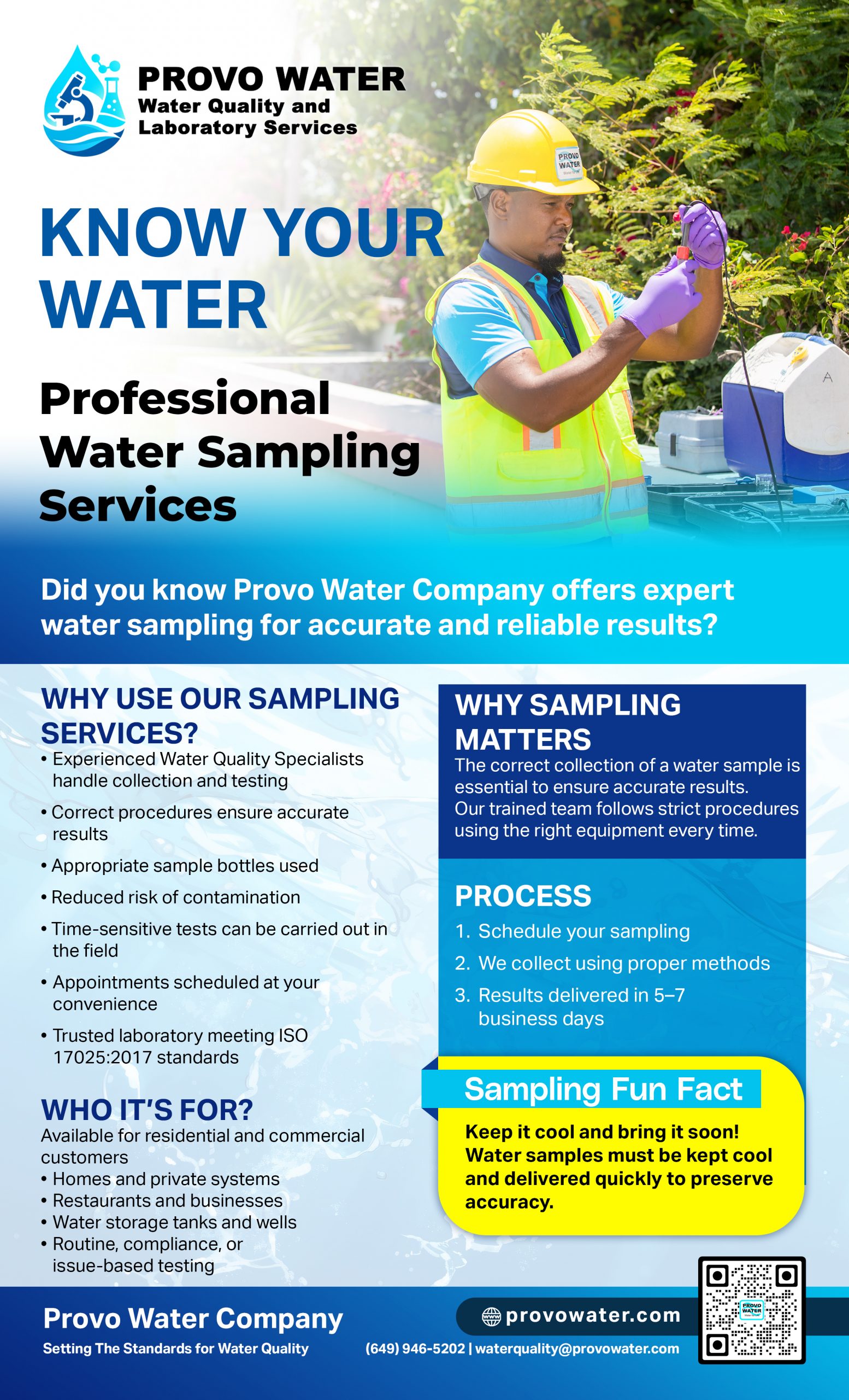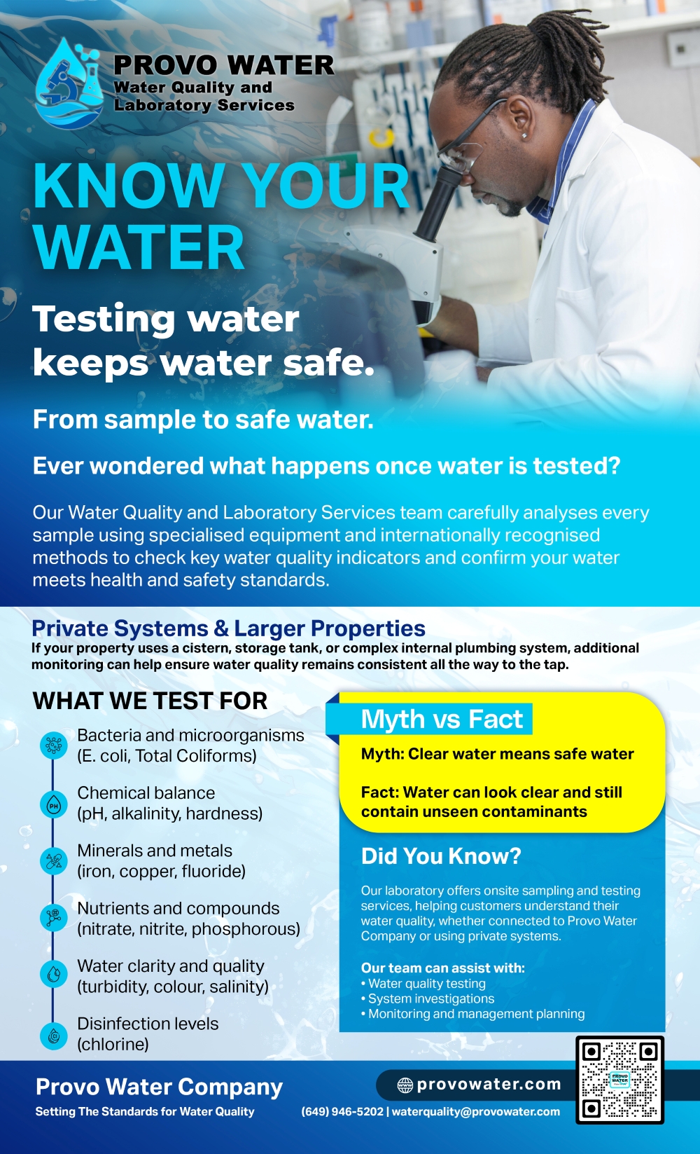 Know Your Water is a public information campaign designed to give customers confidence in the safety and quality of their water. Through clear, simple messaging, it explains how water is treated, tested and monitored before it reaches your tap. The campaign highlights the role of Provo Water Company’s Water Quality and Laboratory Services team, helping people understand that safe drinking water is not assumed, it is carefully managed every step of the way.